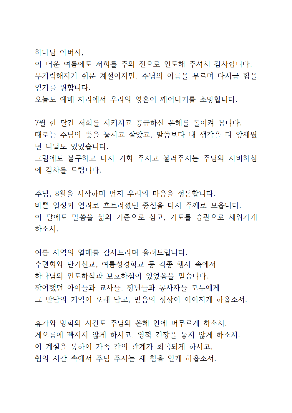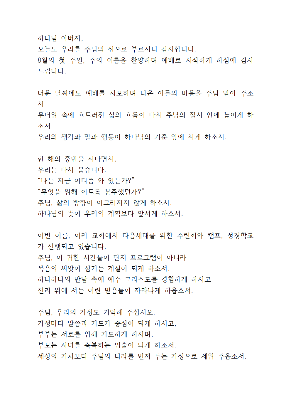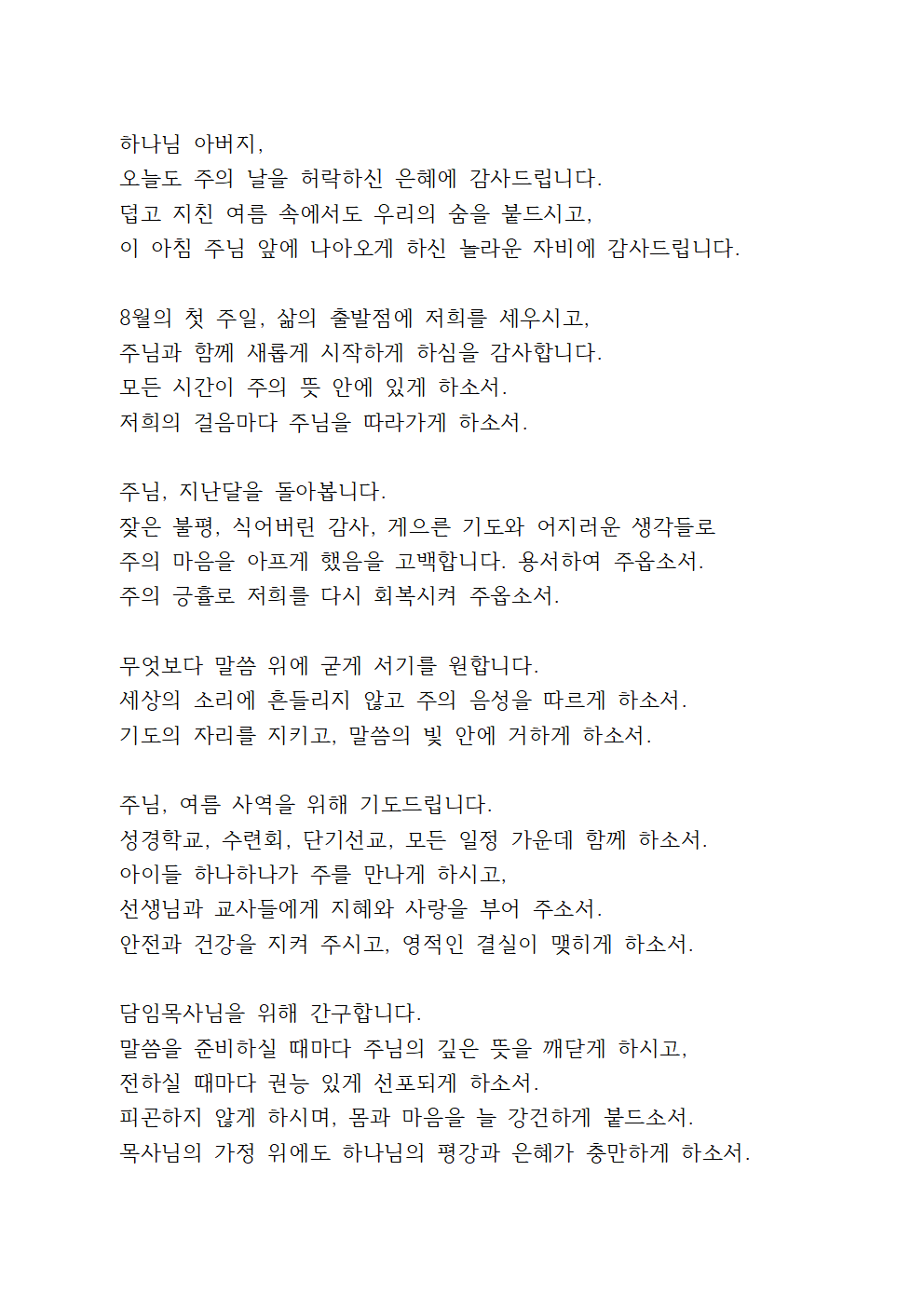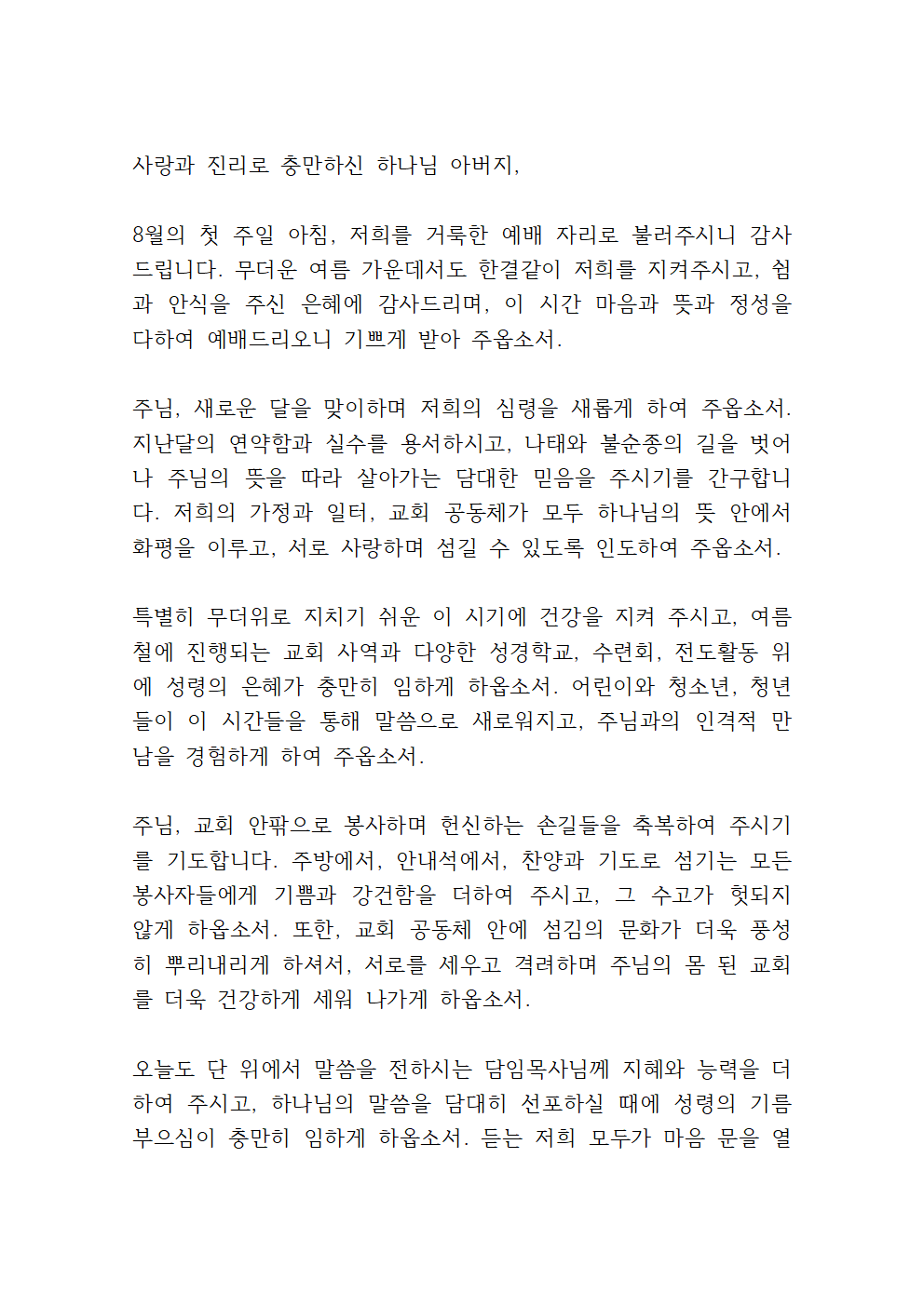 2025년 8월 첫째 주일낮예배 대표기도문 모음 best 5