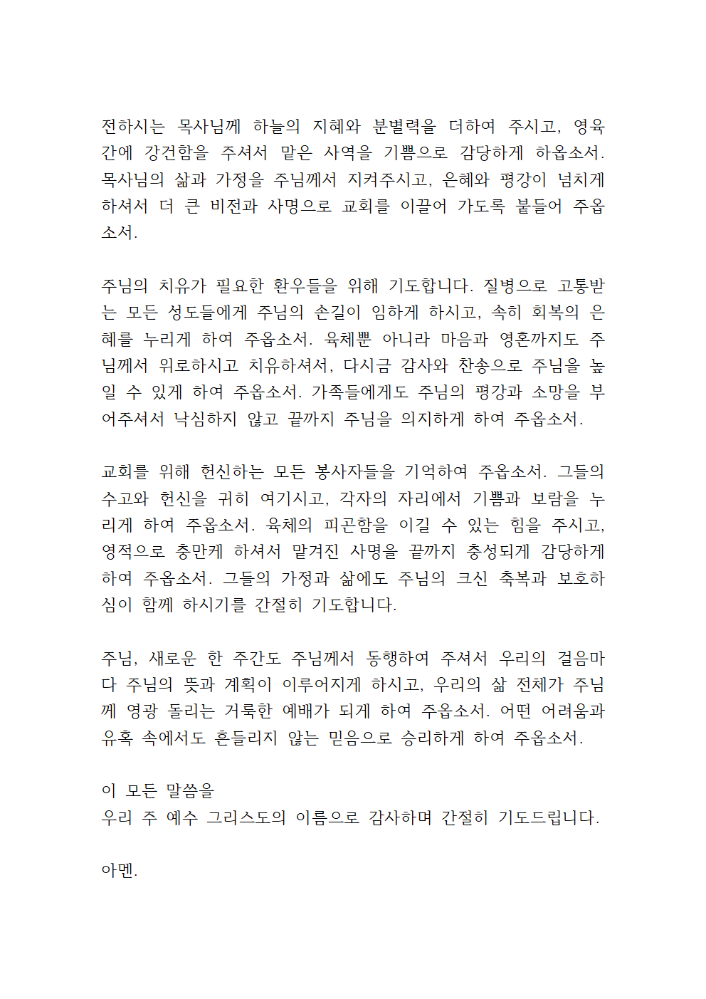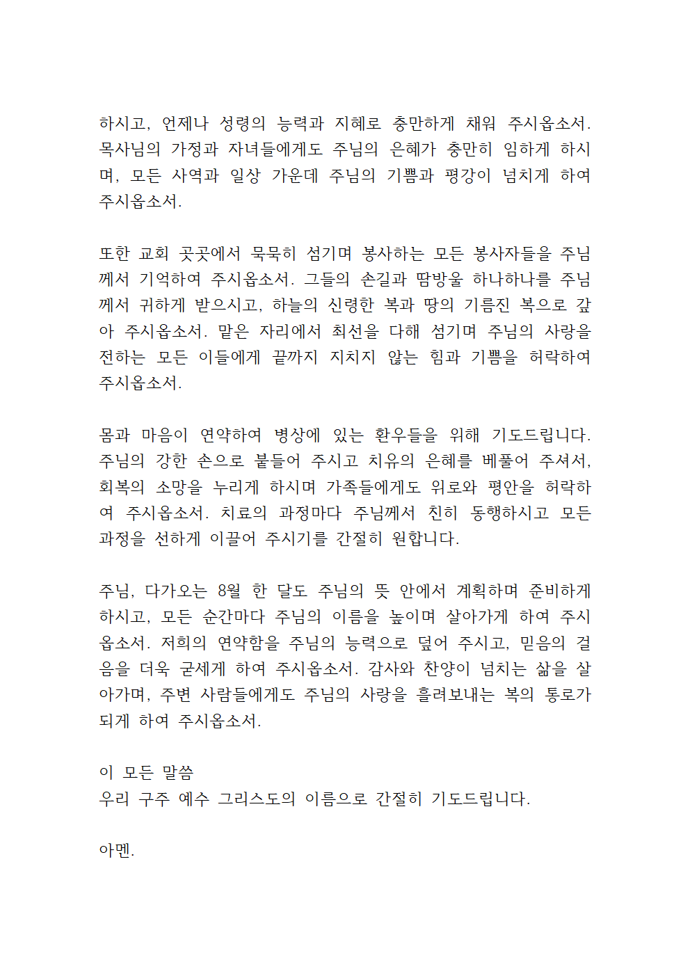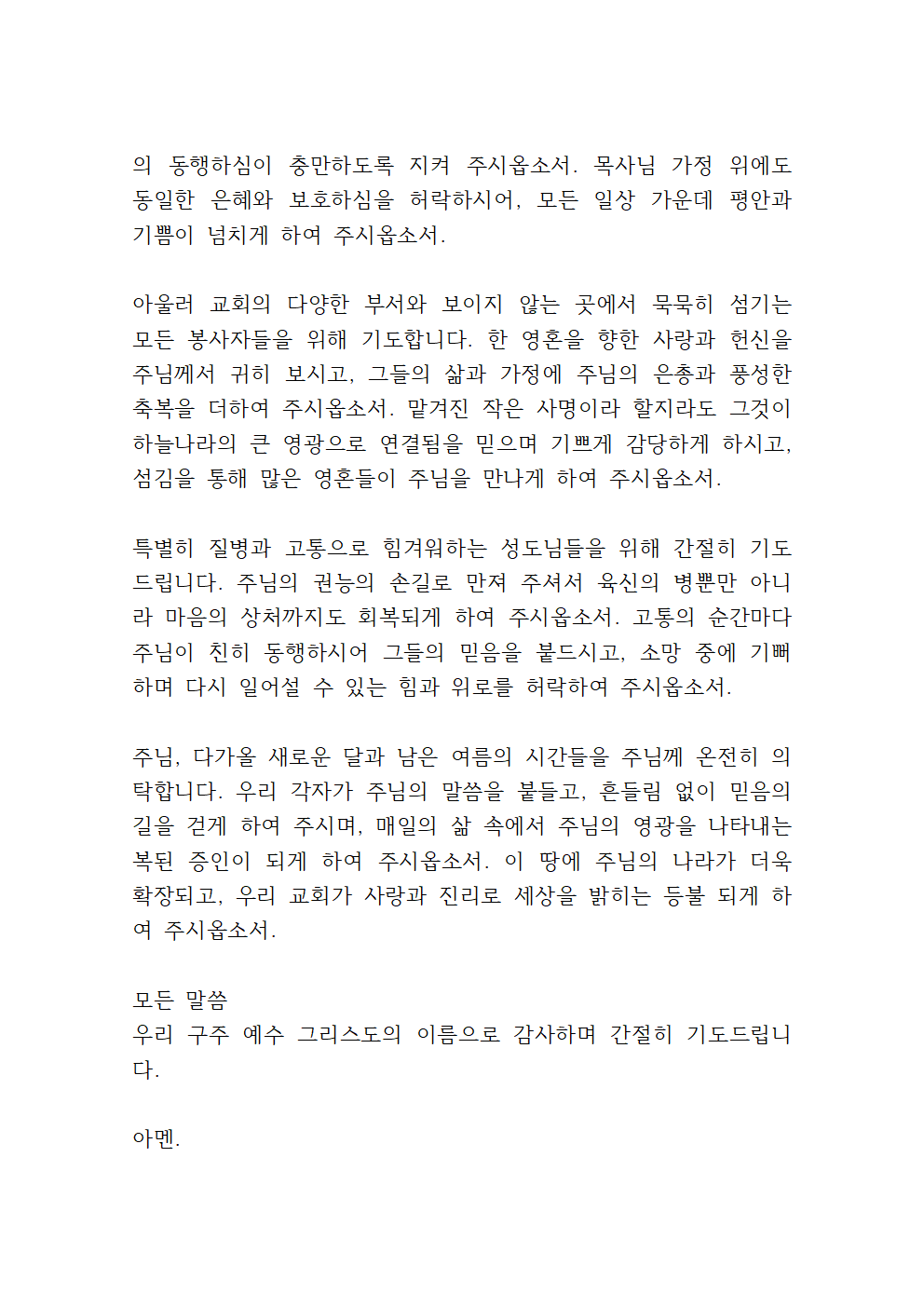 특히 지난 폭우로 인해 삶의 터전을 잃고 고통당하는 수많은 국민들을 위로하여 주시고, 슬픔에 잠긴 이웃들에게는 위로의 팔로 안아주시며, 지역의 재건과 일상의 회복이 속히 이루어질 수 있도록 주님의 자비를 베풀어 주시옵소서.