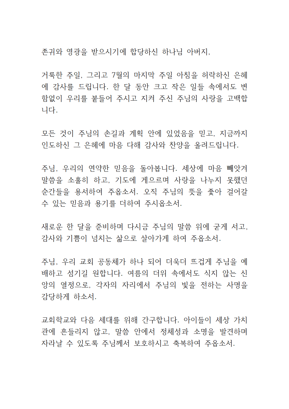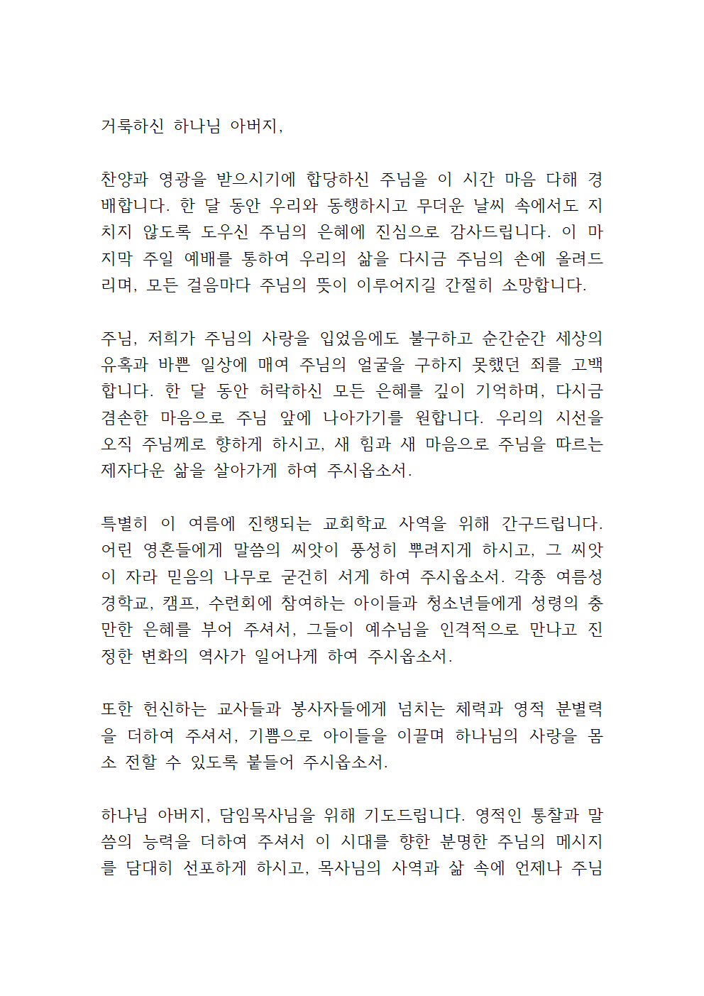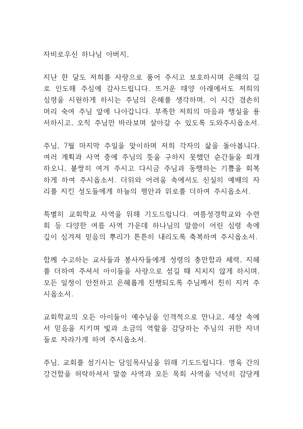 이번 기도에서는 무더위를 위한 기도, 교회 학교의 여름 사역을 위한 기도, 폭우 피해 회복을 위한 기도 등이 포함되면 좋을 것 같습니다.