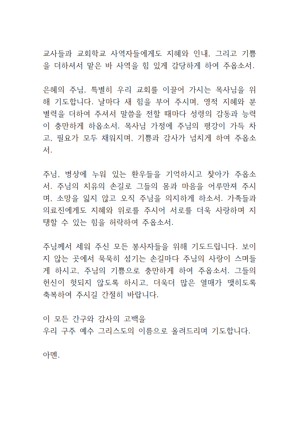주일학교, 찬양팀, 방송실, 주차 봉사, 안내와 식당 봉사에 이르기까지 주님을 사랑하여 기꺼이 헌신하는 모든 손길 위에 하늘의 위로와 상급을 허락하시고, 그들의 삶 속에 주님의 평강이 충만하게 하여 주옵소서.